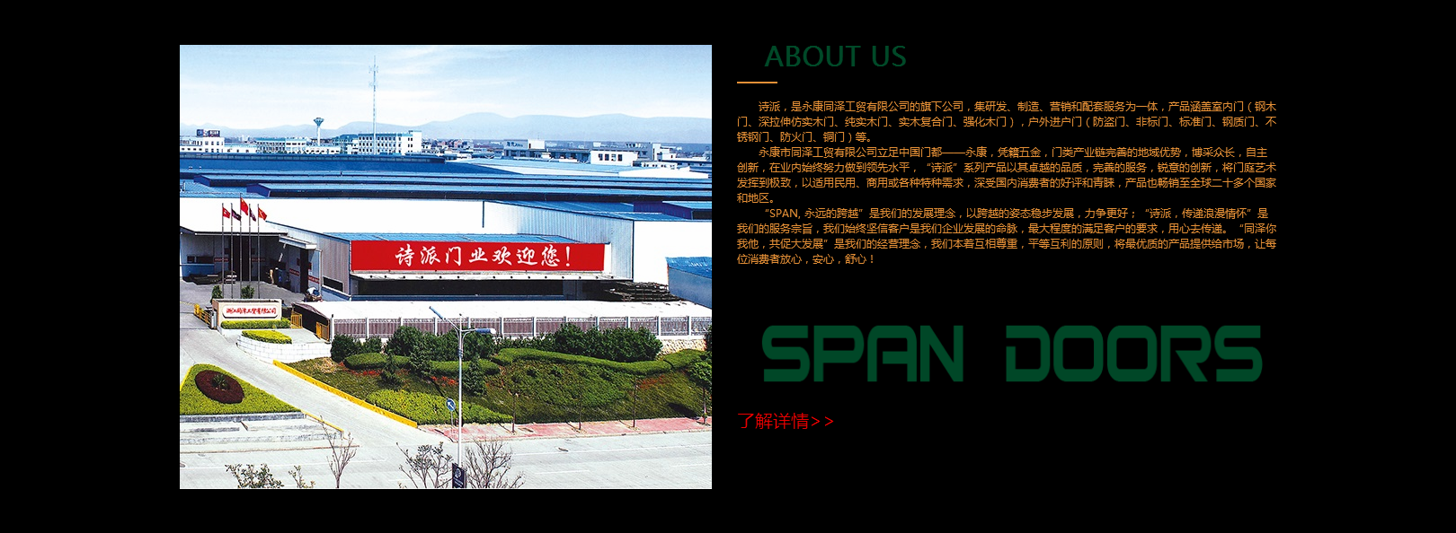 永康市同澤工貿有限公司立足中國門都——永康,憑籍五金,門類產業鏈完善的地域優勢,博采眾長,自主創新,在業內始終努力做到領先水平,“詩派”系列產品以其卓越的品質,完善的服務,銳意的創新,將門庭藝術發揮到極致,以適用民用、商用或各種特種需求,深受國內消費者的好評和青睞,產品也暢銷至全球二十多個國家和地區。