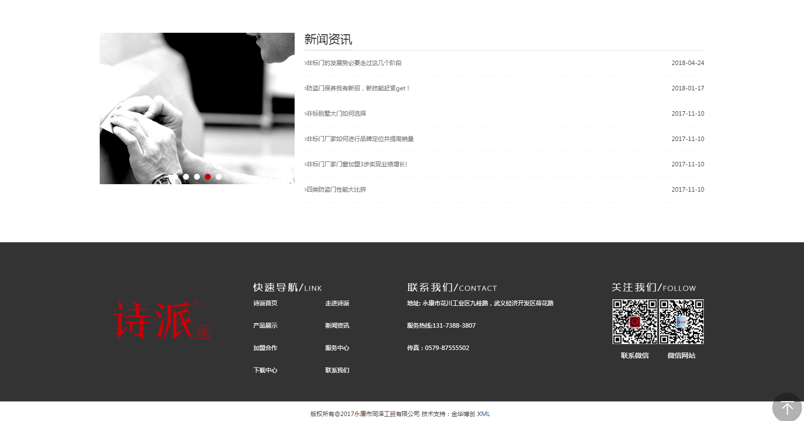 詩派,是永康同澤工貿有限公司的旗下公司,集研發、制造、營銷和配套服務為一體,產品涵蓋室內門(鋼木門、深拉伸仿實木門、純實木門、實木復合門、強化木門),戶外進戶門(防盜門、非標門、標準門、鋼質門、不銹鋼門、防火門、銅門)等。